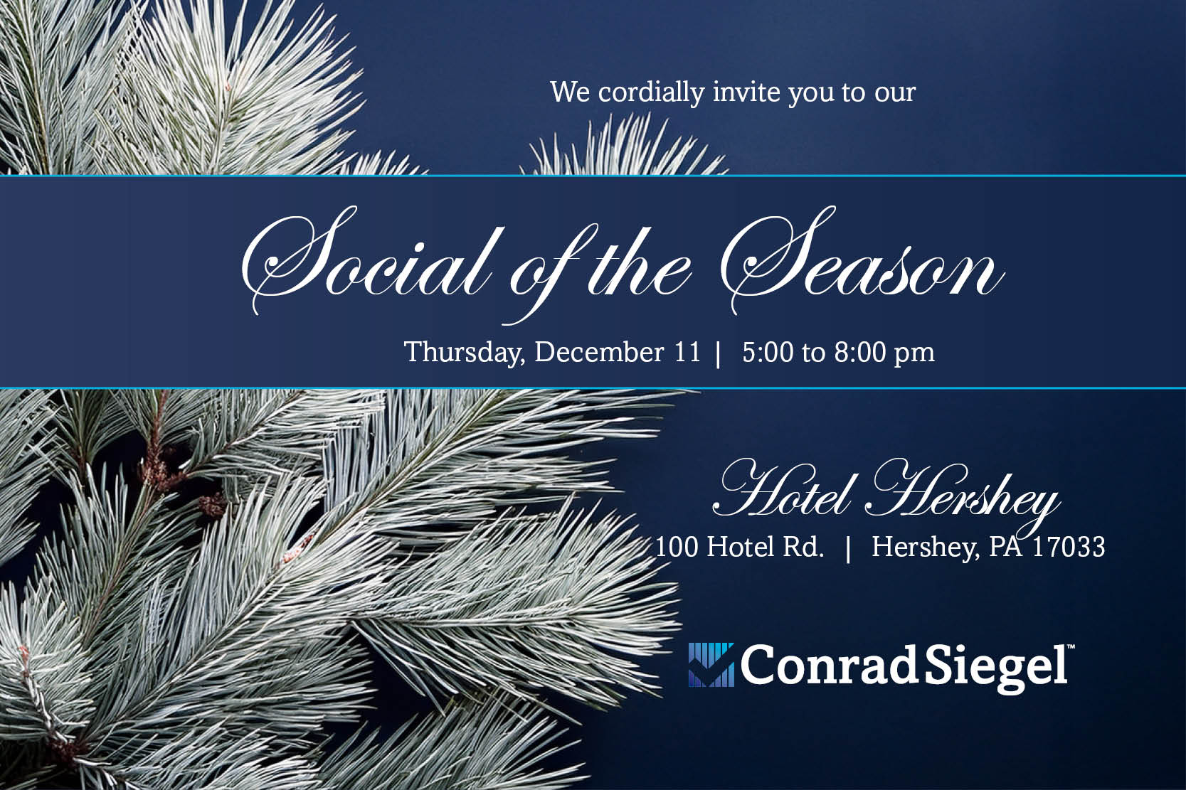 As the end of the year and holidays approach, we want to express our appreciation for our relationship with you. We invite you and a guest to join the Conrad Siegel team on Thursday, December 11th from 5:00 to 8:00 PM at The Hotel Hershey for an evening of drinks, hors d’oeuvres, and conversation.